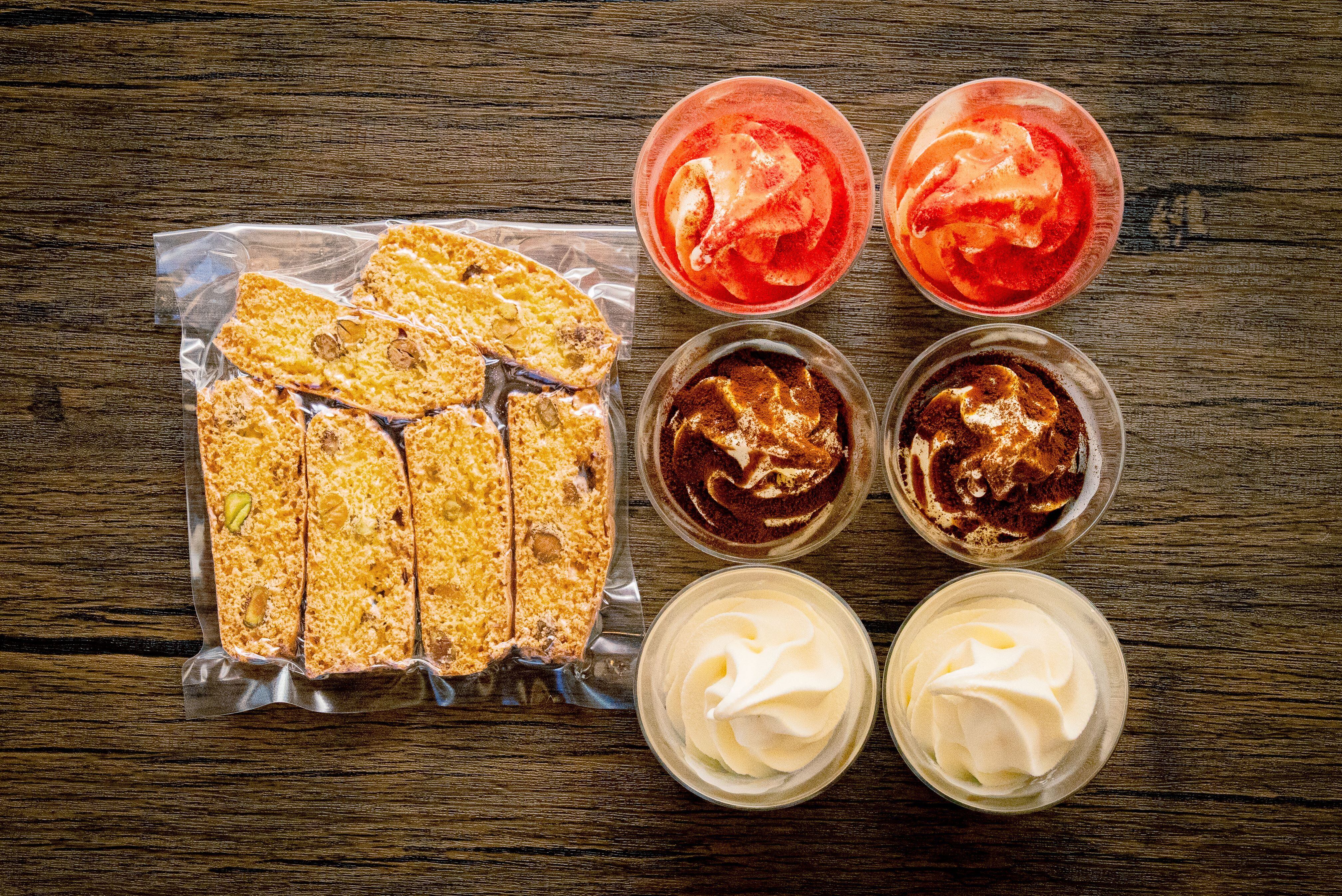 濃厚でありながら軽やかなくちどけのこのソフトクリームをご自宅にお届けします。内容はマスカルポーネ、ティラミス、仙台いちご、そして宮城県産小麦を使ったビスコッティです。